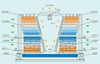 客户所需要的工作介质的循环,热的介质由上部的盘管进口流入经过换热盘管内部,把热量通过换热盘管管壁散给外部的空气和喷淋水,被冷却后由下部的盘管出口流出;