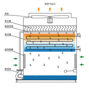 客户所需要的工作介质的循环,热的介质由上部的盘管进口流入经过换热盘管内部,把热量通过换热盘管管壁散给外部的空气和喷淋水,被冷却后由下部的盘管出口流出;